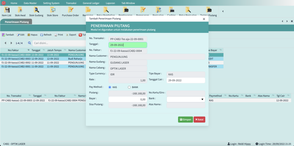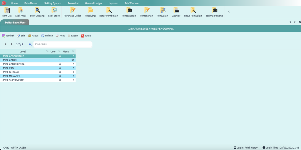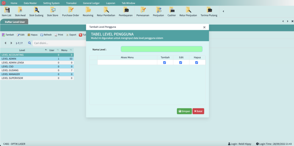 Didalam fitur ini Anda bisa setting keperluan sistem dan laporan transaksi mulai dari payment cash flow, transaksi toko, gudang dan banyak lainnya.